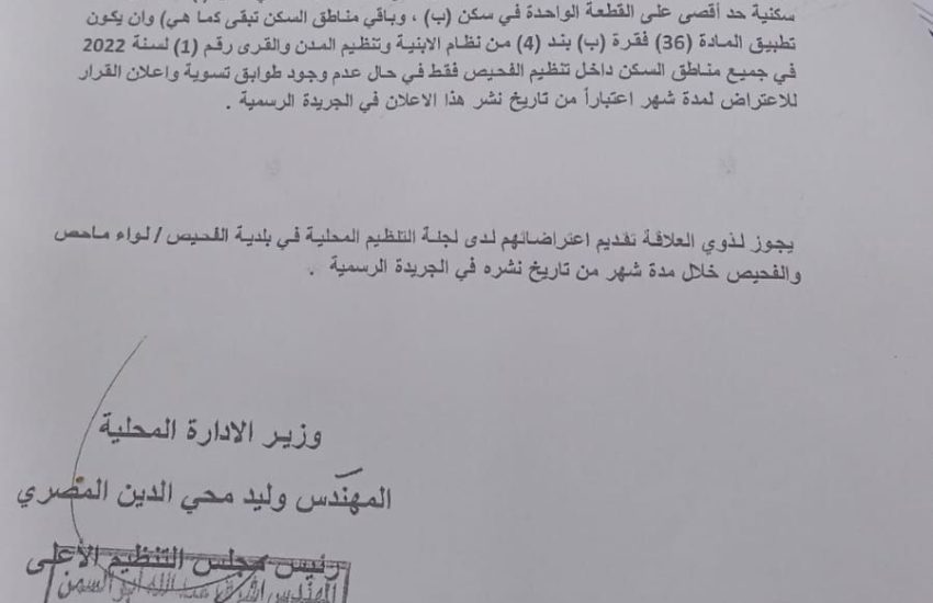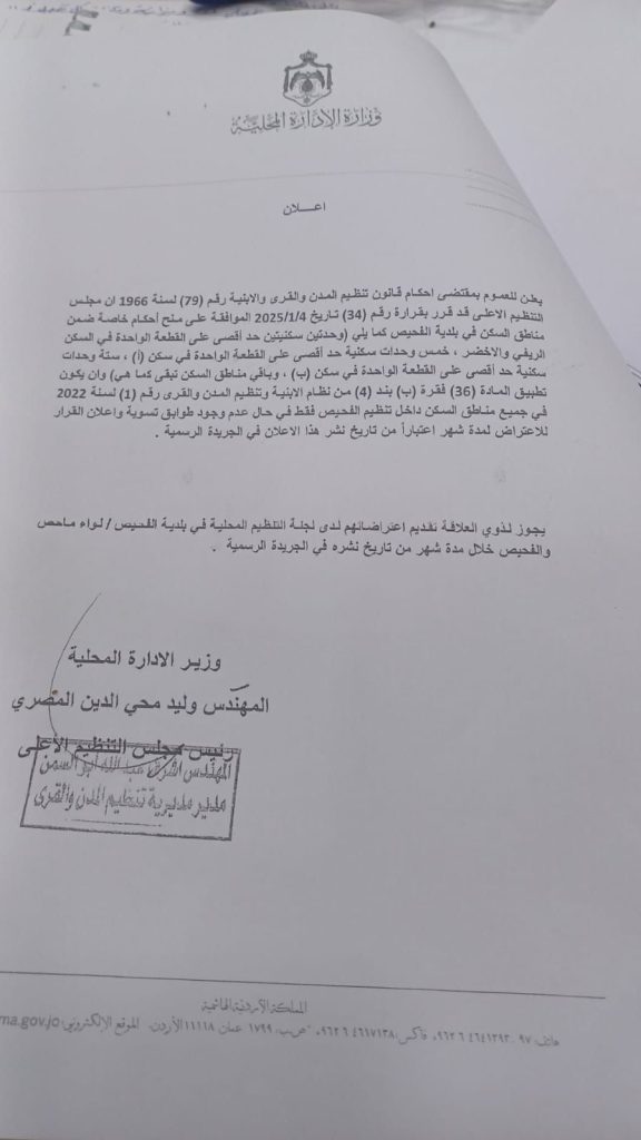 حققت بلدية الفحيص إنتصار حقيقي بصدور قرار المجلس الأعلى لتنظيم أعمال البناء، الذي حدد عدد الوحدات السكنية المسموح بها ضمن مناطق السكن في البلدية. وجاء القرار بالسماح بوحدتين سكنيتين كحد أقصى على القطعة الواحدة في مناطق السكن الريفي والأخضر، وخمس وحدات سكنية كحد أقصى في مناطق السكن (أ)، وست وحدات سكنية كحد أقصى في مناطق السكن (ب).